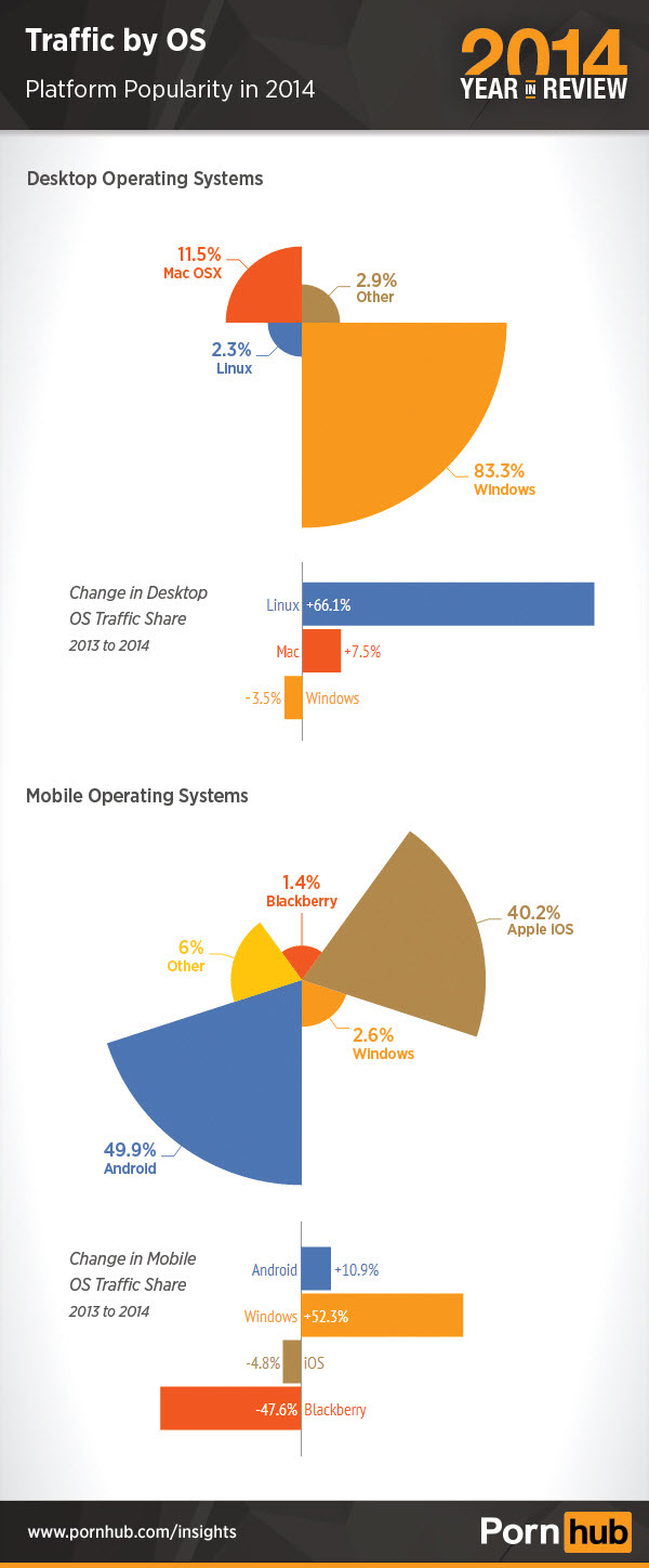 Windows remains the most popular operating system among Pornhub users in 2014, accounting for an impressive 83% overall on desktop. However, this is still 3% down from last year, meaning that some Pornhub users are making the switch over to OS’s like Macintosh (up .8% and accounting for 11.5% of overall desktop users) and Linux (up .9% and accounting for 2.3% of overall desktop users). We touched on these figures in our Gizmodo collaborative back in September 2014, Porn’s Operating System Battle as well as the specific searches and visit durations particular to users on each type of operating system. Another look at this data reminds us that Windows users have a definite mama fetish, as made evident by MILF porn star Lisa Ann leading as the most searched for on this particular OS, followed by search term ‘mom’. They are, however, quite a bit quicker than MacOS users at getting the job done as Windows users spend a mere 8 minutes and 39 seconds with 7.41 pages viewed per visit on average, whereas MacOS users are taking their time with visits generally lasting in the 9 minute and 31 second camp, with 8.85 pages viewed.
