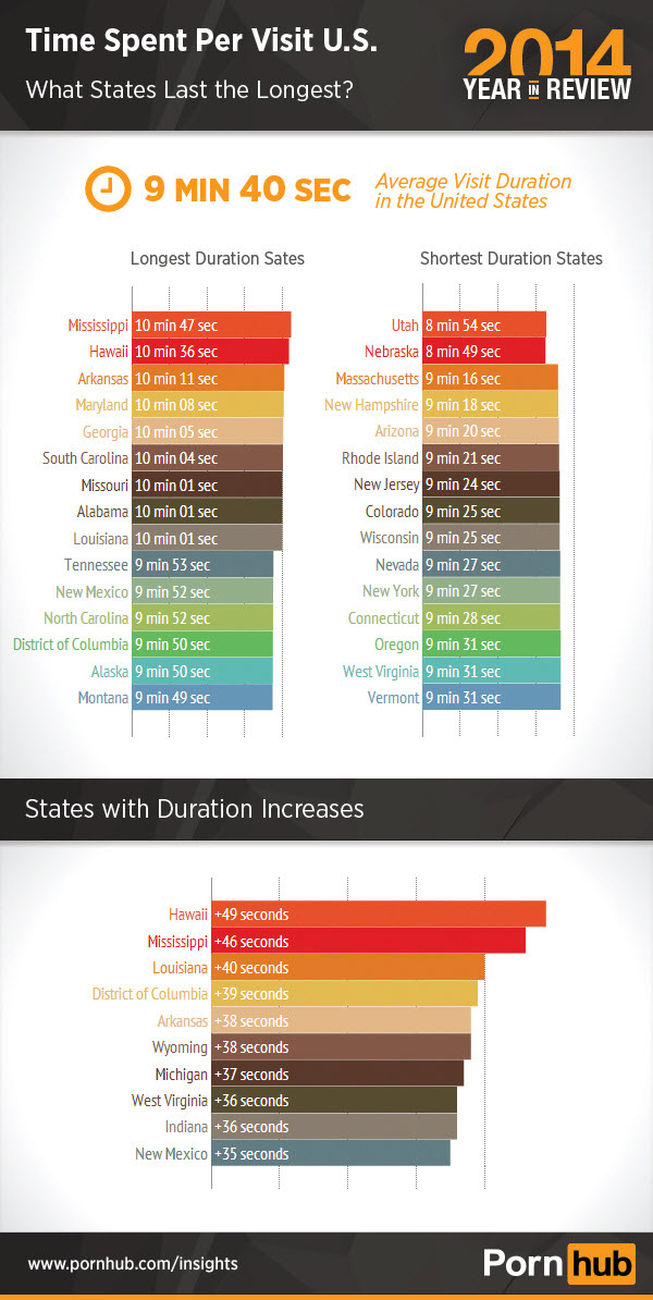 When we examine how long Americans last on a state by state level, it’s immediately clear that Mississippi works hard and plays hard. According to the most recent American Time Use Survey (ATUS) compiled by the American Bureau of Labor Statistics, Mississippi boasts some of the highest averages for both daily sleep hours and time spent working in a day. Incidentally, they also hold the current American record for longest average visit time on Pornhub, with an impressive 10 minutes and 47 seconds. They’re hanging loose in Hawaii with a respectable 10:36 average visit length, alongside Arkansas at 10:11. Overall, these lengthier visits occur within the southeastern states, with the exception of Hawaii.