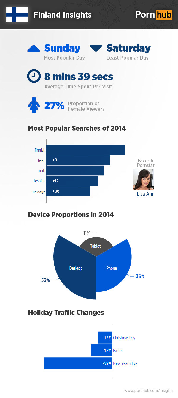 We’ll finish off with Finalnd where they too are still peeping Pornhub on their PCs for the most part as a considerable 53% of traffic shares are desktops. Perpetual fan favorite Lisa Ann tops the charts as the most searched for porn star in the land, whom undoubtedly many Finns are searching for during their solid 8 minute and 39 average sessions.