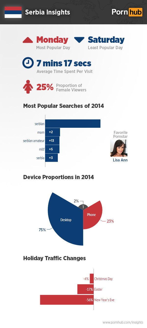 They keep it pretty quick on Pornhub in Serbia with the average visit lasting only 7 minutes and 17 seconds. According to their top searches, they’re also very specifically interested in themselves and moms as all of the top terms are oriented around MILFs and Serbians. To each their own!