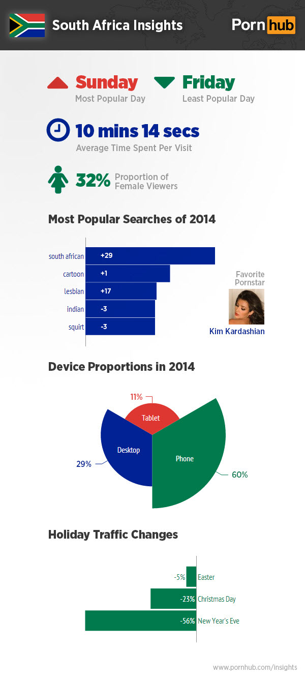 We tip our hats to you, ladies of South Africa, for accounting for a knockout 32% of the Pornhub viewership in your gorgeous country. South Africans are also all about that portable porn, with 71% of their traffic shares originating from mobile devices. Another fun fact? ‘South African’ now tops the list for most popular search term in the land, after an impressive 29 spot climb. Last year’s ‘Indian’ has been knocked down 3 spots.