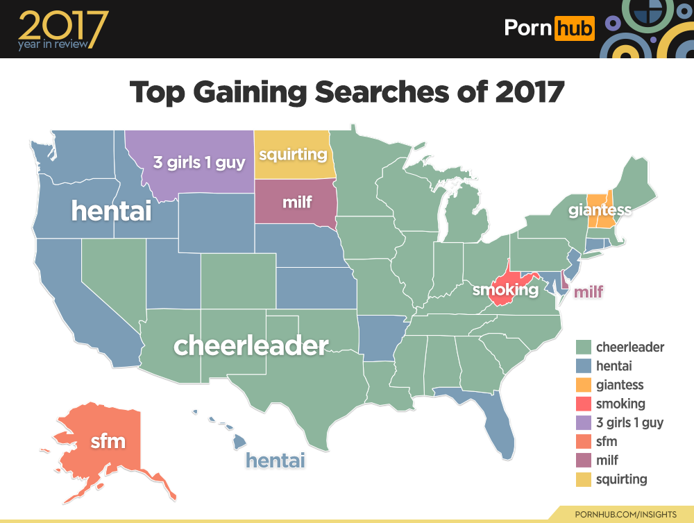More West Virginian’s took up ‘smoking’ (searches) in 2017, and North Dakota showed more interest in ‘squirting’. Many parts of the U.S. followed the worldwide trend and discovered ‘hentai’ in 2017. In Alaska — the only state where ‘hentai’ actually ranks #1 — searches increased in 2017 for ‘sfm’, short for Source Filmmaker, a popular 3D modelling tool used to generate hentai porn videos.