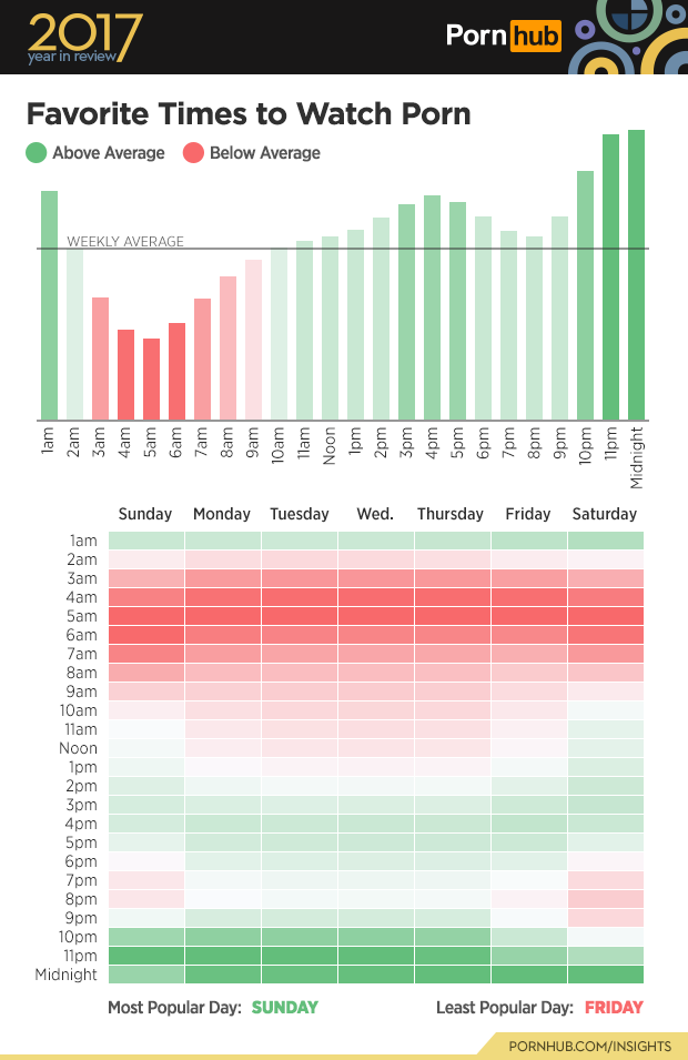 We expanded our search to see what time of day and which day of the week Pornhub users around the world are most likely to get busy. People tend to be pretty regular with the porn viewing habits, so hourly traffic rates to Pornhub haven’t changed much in the last year. There is generally a lull in traffic between 2am and 9am, when people are either sleeping or heading out to start their day. On most days, and in most parts of the world, traffic reaches its highest level from 10pm to midnight. Pornhub sees the highest volume of traffic on Sundays and lowest on Fridays.