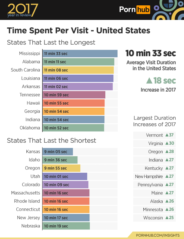 In the United States, the average visit time on Pornhub increased by 18 seconds over the last year, to 10 minutes and 33 seconds. Everyone has managed to stay ‘on’ for longer, and in almost the exact same order as last year…staying true to the southern states saunter. Mississippi is taking after their very own Mandigo, and is lasting the longest (once again) with sessions there lasting an average 11 minutes and 33 seconds. However, South Carolina has taken third place from Louisiana’s with 11 minutes and 8 seconds. Vermont (up 37 seconds) and Virginia (up 30 seconds) have made the largest increases at state level for average time on site for 2017. There are still several states that come and go a lot faster, with Kansas spending the least amount of time on the site when they visit Pornhub, at 9 minutes and 5 seconds.