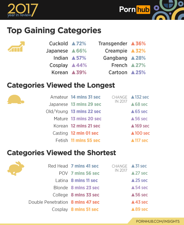 Topping off the gaining categories for 2017, is ‘Cuckold’ (nsfw) where views have increased by 72%. Popularity for the Transgender (nsfw) category increased by 36%, and ‘Cartoon’ (nsfw) is up by 25%. ‘Amateur’ (nsfw) caught viewers’ attention for the longest amount of time at with views on videos in the category lasting an average of 14 minutes and 31 seconds, which is 132 seconds longer than last year. Views in the ‘Fetish’ (nsfw) category are also up with a 117-second increase from last year, at 11 minutes and 55 seconds.