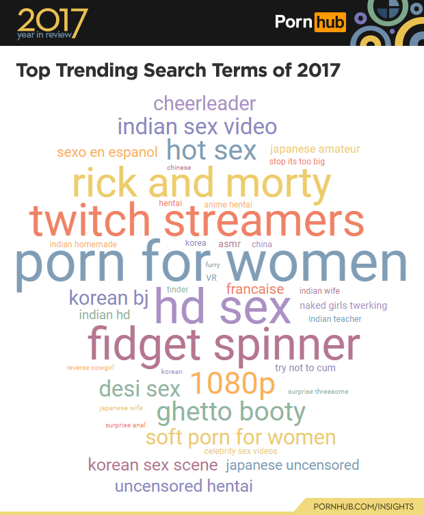 Rick and Morty porn parodies also blasted off this year, and the passing fascination with Fidget Spinners caused a big spike in porn searches (and some very creative amateur videos). Lots of people discovered ASMR (Autonomous Sensory Meridian Response) porn this year, too and liked what they heard. We also saw major increases in the popularity of Hentai (nsfw) around the world, and fans of cheerleaders caused a massive boost in these searches as well.