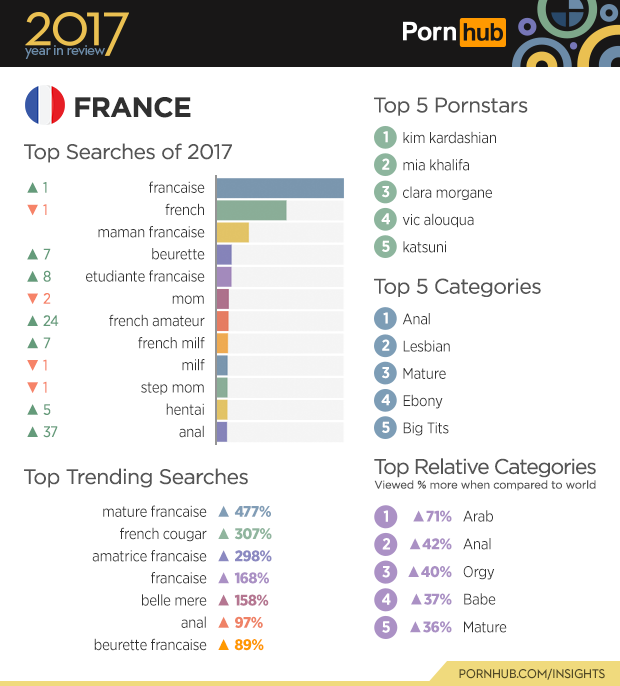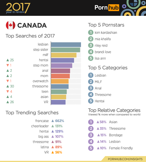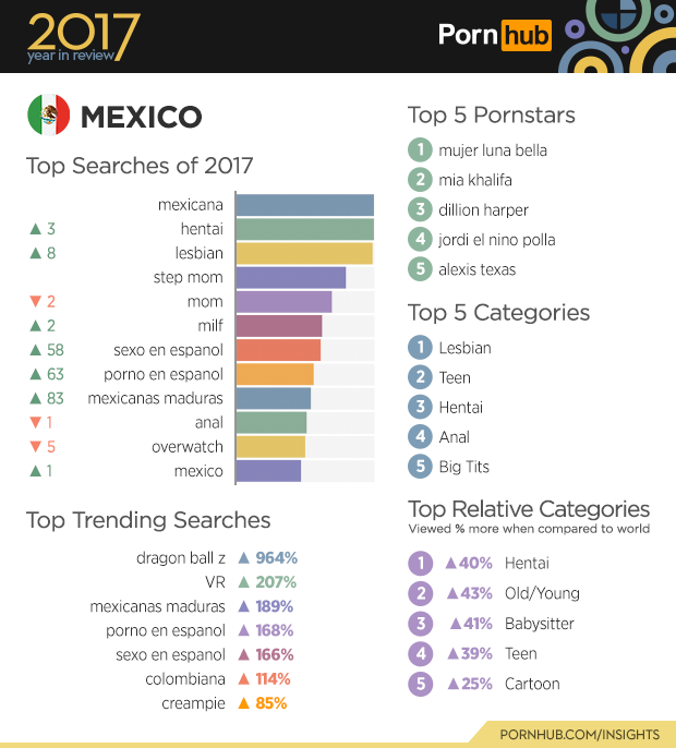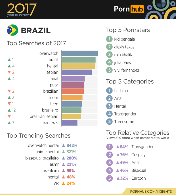 Over in Brazil the ‘Bisexual’ category is viewed 46% more than in other countries. Searches for ‘Bissexual brasilero’ meaning ‘bisexual brazilian’ also jumped up by 280% compared to last year. ‘Brasileiro’ jumped 12 spots in the top searches for the year, and somehow ‘brazilian’ took 2 steps back. ‘Overwatch’ the very popular video game that also dominated our 2016 year in review is still standing as the top search for 2017 in Brazil. The rise in popularity of ‘overwatch hentai’ is shown by the 842% increase, ‘hentai’ on its own claimed third place in the top five categories, and increased by 4 spots on the top searches.