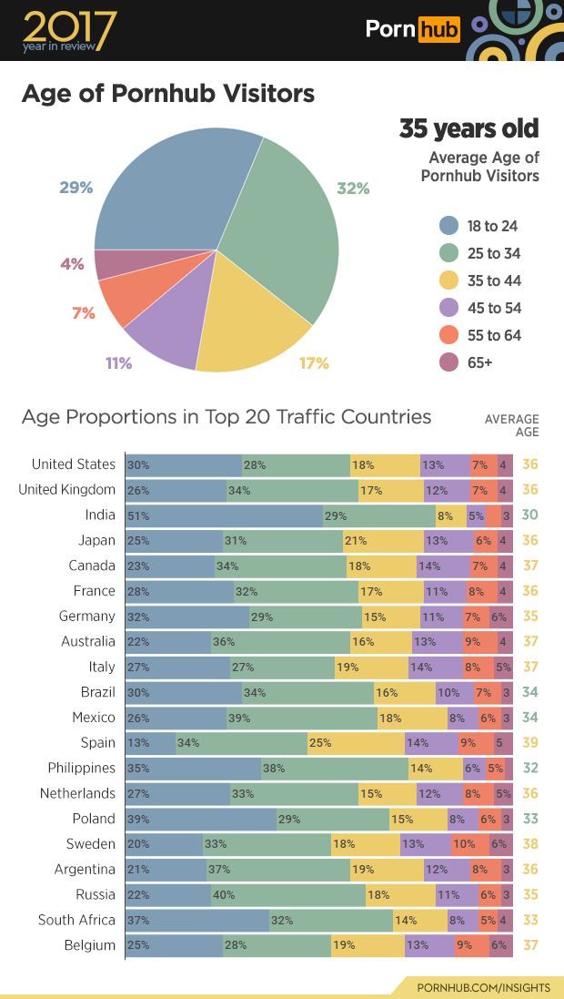 The average age of visitors to Pornhub remains 35 years old. The largest proportion of viewers to the site are between the ages of 25 and 34 year olds, making up 32% of Pornhub’s visitors. Viewers between the ages of 18 and 24 made up 29% of our entire viewership in 2017, which is actually a 2% decline from last year. Out with the young, and in with the older as the saying almost goes! Viewers between the ages of 35 and 44 account for the third largest group at 17%. The 55+ crowd are not slowing down either, making up 11% of Pornhub’s visitors!