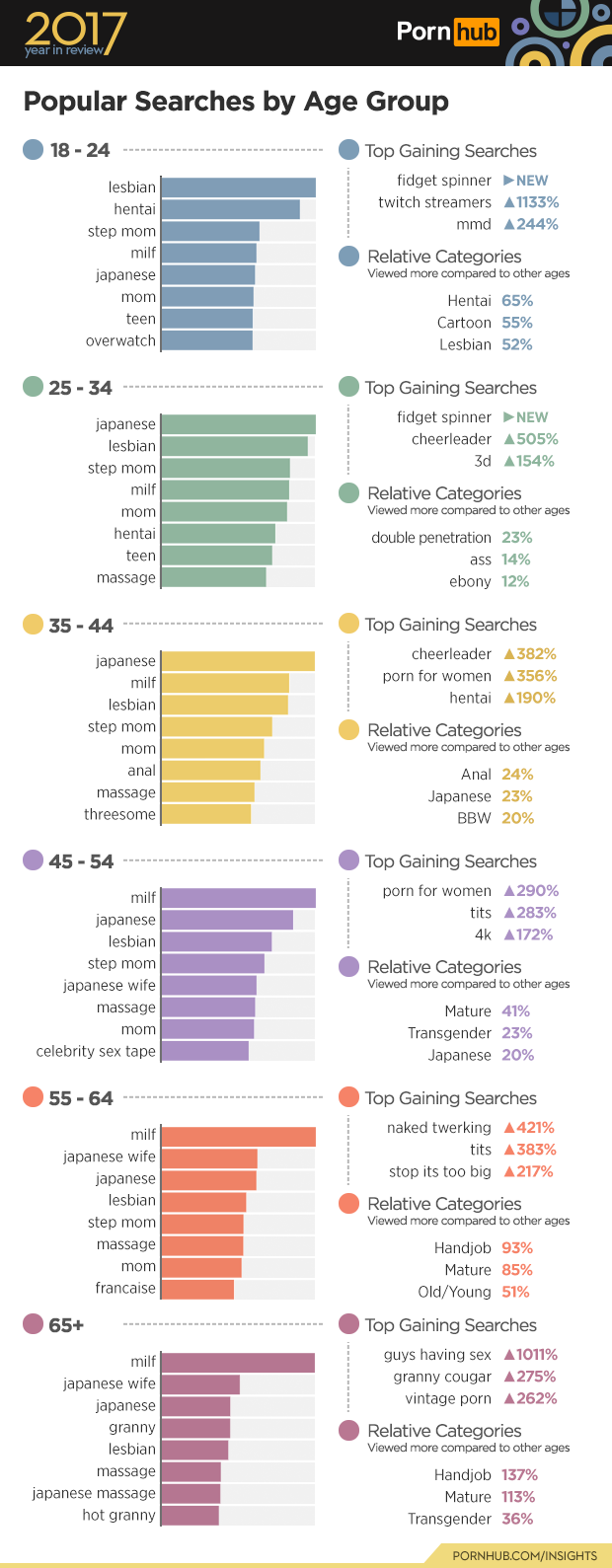 There was a huge increase in searches for ‘Twitch Streamers’ for the 18-24 year olds this year (+1133%); this was also the only age range that took interest in searching for ‘Fidget Spinners’. ‘Hentai’ (+65%) and ‘Cartoon’ (+55%) were once again viewed more by this age group than any other, but by smaller percentages, meaning the other ages are taking more of an interest! ‘Massage’ also became a more popular search this year, making its way onto every age group’s top searches, except for the 18-24 year olds, who didn’t seem to get the message.