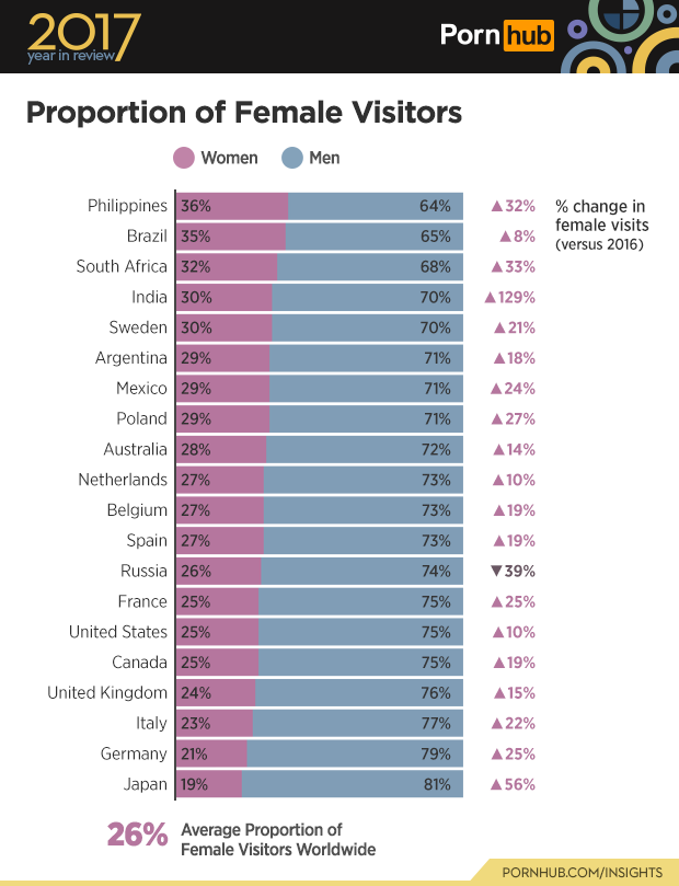 Staying consistent to last year’s reports, the average proportion of female visitors to Pornhub worldwide remains at 26%! Russian women, however, were not rushin’ to the website this year, being the only top 20 country where female visits decreased in 2017, although that’s in line with Russia’s six spot fall in overall traffic rank. India’s female visitors increased the most out of any other country compared to last year, by 129%. There was also a higher percentage of female visitors in Japan with a 56% increase over last year.