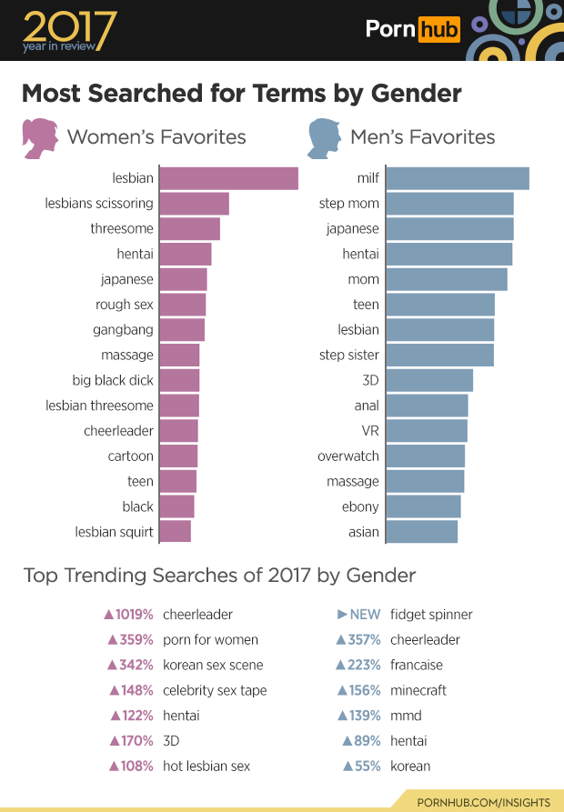 Women are not the only sex seeking out a cheer squad, as ‘Cheerleader’ increased in searches by 357% for men as well. ’Fidget Spinner’ made its debut on the most searched terms for 2017, and since they were unheard of in 2016, we have no numbers to compare the increase to just yet! It would seem that men were more interested in speaking the language of love this year with ‘francaise’ increasing by 223% from last year’s searches. It appears that many men are still playing games with ‘minecraft’ making a 156% increase over last year’s searches. The terms ‘MILF’ and ‘step mom’ remain the top searches for men in 2017. ‘Japanese’ has taken a step forward, grabbing third place from last year’s ‘step sister’. Hentai’s searches increased by 89% compared to last year, and landed ‘hentai’ as the fourth most searched term for men. ‘Massage’, ‘Ebony’ and ‘Asian’ rounded out men’s favorites just as they were last year, but ‘anal’ managed to work its way up four searches from the bottom, surpassing ‘overwatch’ and ‘VR’.
