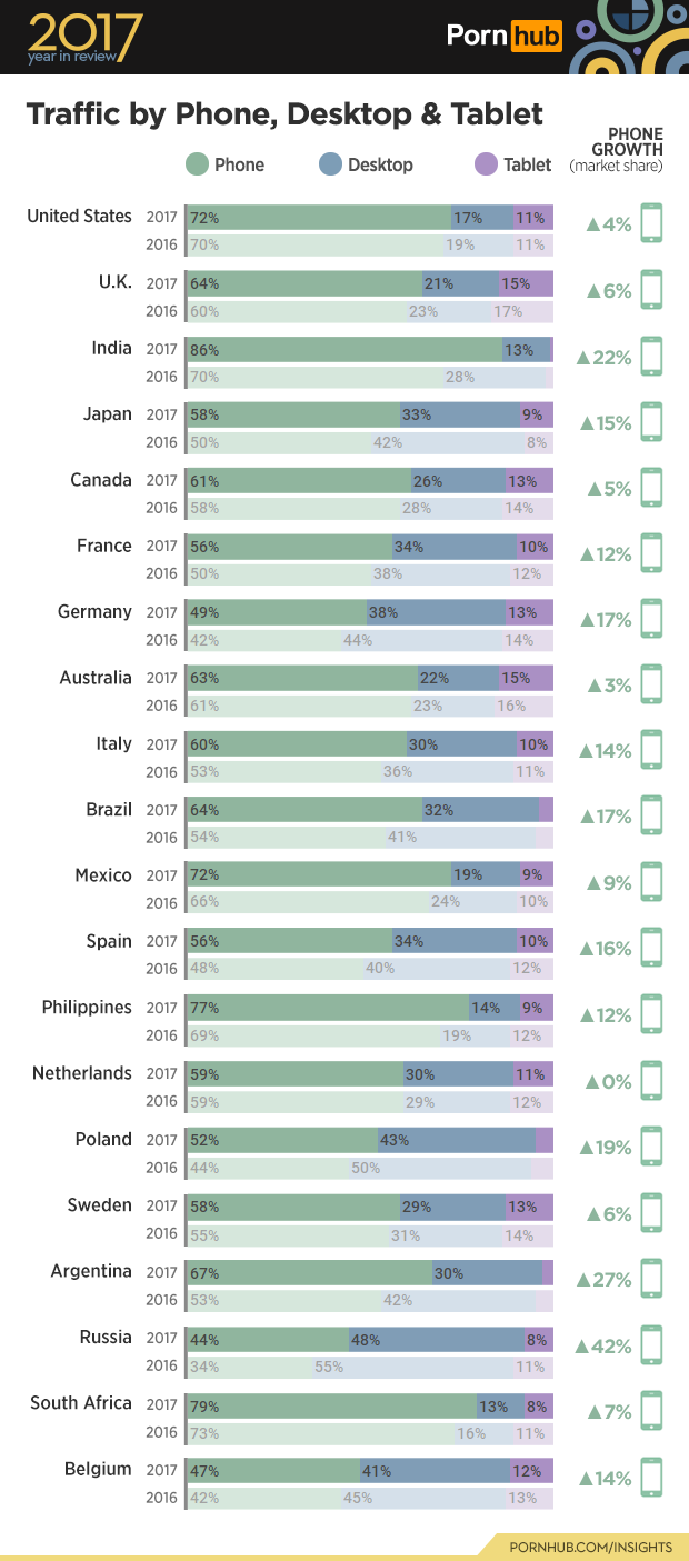 Many of Pornhub’s top 20 traffic countries have the largest share of smartphone visits, and all had further growth in 2017. In the United States, 83% of all visitors are now using mobile devices. Across North America we also see 81% mobile use from Mexico and 74% from Canada. Highest amongst the Top 20 are South Africa and India, where 87% of visitors are on mobile devices. India’s 22% increase in smartphone market share was most likely due to their inexpensive and unlimited cellular data plans. There are however some exceptions. While Russia saw a 47% increase in Smartphone market share compared to 2016, it still lags behind other Top 20 countries with nearly half of visitors still using desktop computers.