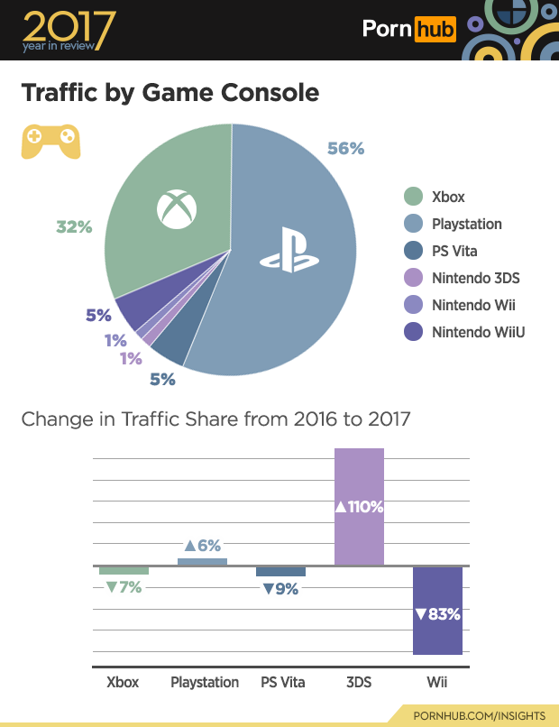 Pornhub’s development team works tirelessly to make sure that users can enjoy their experience on a wide variety of devices, and that includes visiting Pornhub on game consoles. What could be better than taking a break from playing games to play with yourself? And you don’t even have to leave your seat. Xbox’s share of console traffic dropped by 6% since 2016, while Playstation gained once again to now represent 56% of gamers watching porn. Nintendo’s portable 3DS had a large increase in market share but still only makes up 1% of game device traffic.