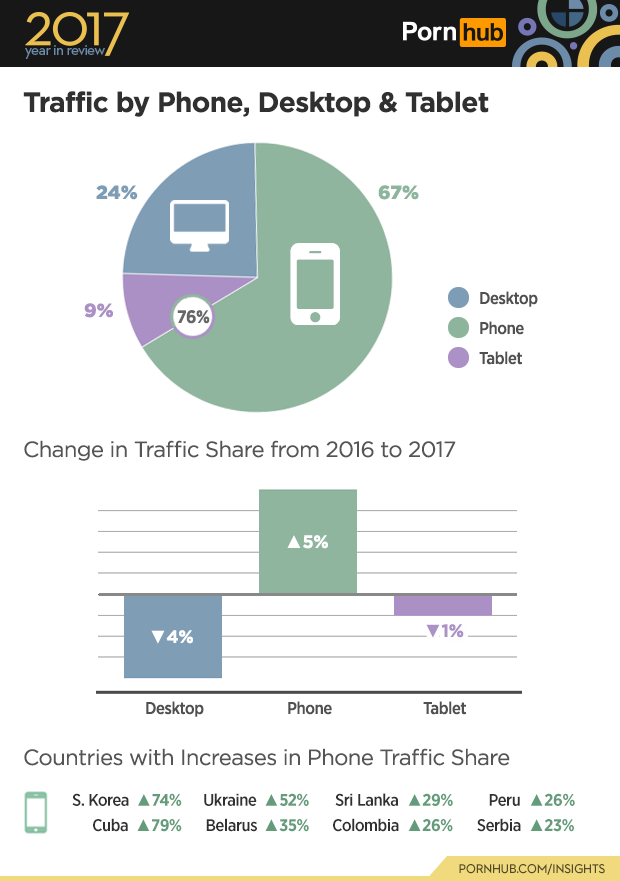 Throughout 2017 smartphones continued to rise a further 5% in market share, now representing 67% of all traffic, joined by tablets making up a further 9%. Desktop (and laptop) computers now make up less than a quarter of all Pornhub traffic. Some countries had substantial increases in smartphone use, such as South Korea with 74% growth in market share and an increase of 79% in Cuba.