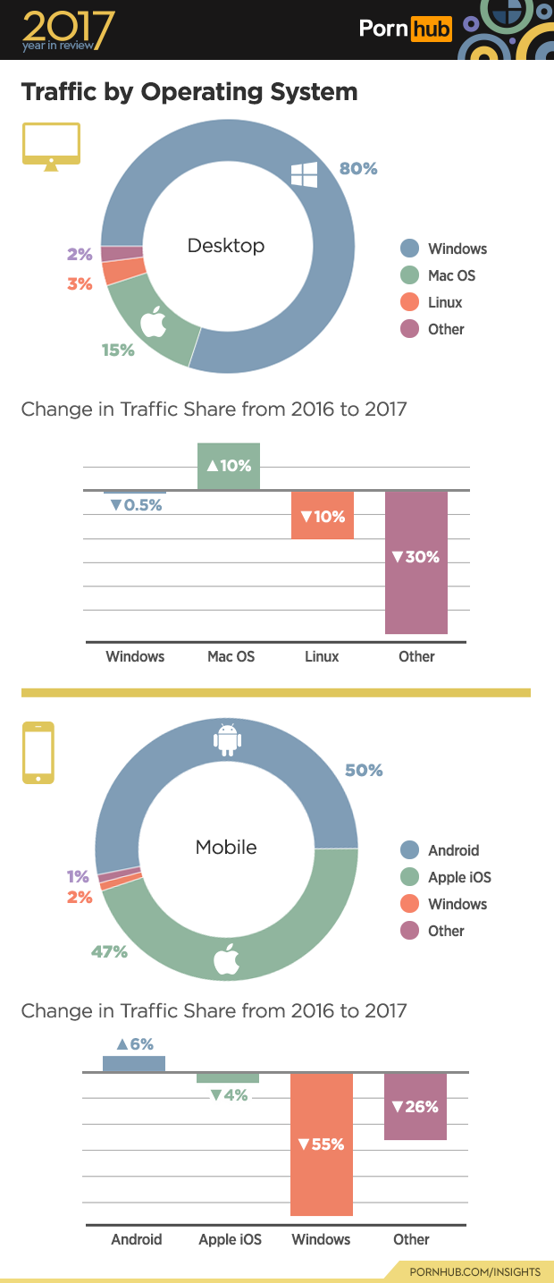 With more than 80 million daily visitors, studying the operating systems by which visitors use Pornhub can give us insight into broader industry trends. Through 2017 Windows maintained 80% of desktop traffic, while Mac OS increased its share by 10%. Much of Mac’s gain came from other operating systems like Linux which now represents just 3% of desktop traffic.