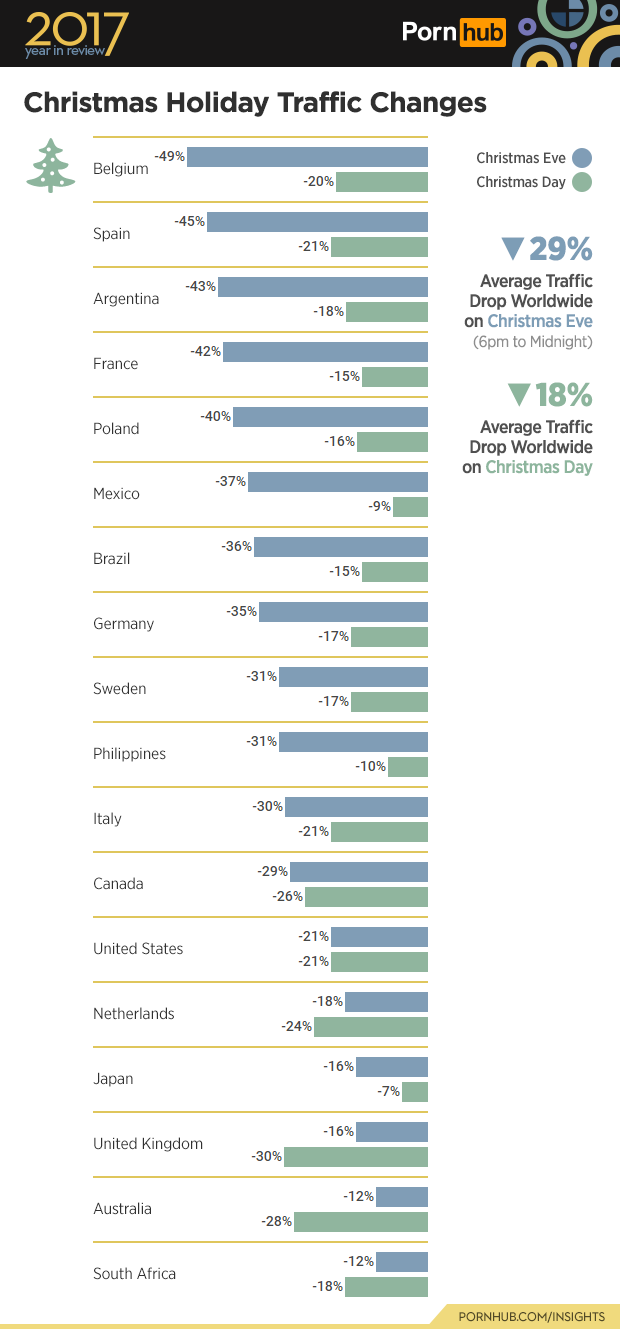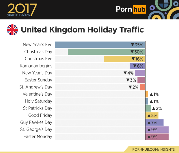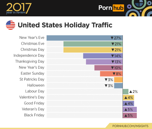 Some things never change, and that includes the fact that traffic to the site always slows down on December 31st. In 2017, between 6pm and midnight (to be exact) people were watching way less porn than they regularly do. As is tradition, the traffic dropped lower than any other day of the year (by 37%) which was actually 7% less than on December 31st, 2016.