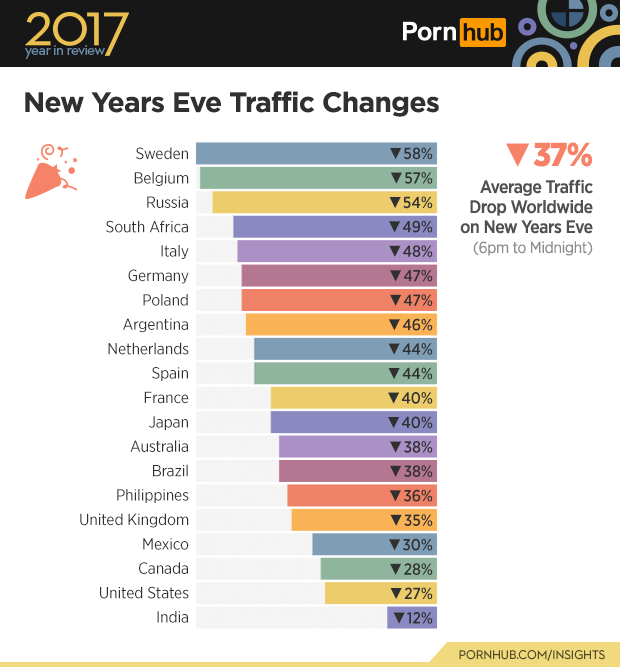 Once again, Sweden was busier than any other country on New Year’s Eve, with their traffic dropping by 72%. The United States (-27%) and India (-12%) were still getting busy on Pornhub with as the New Year rang in, with the lowest dips in traffic worldwide on the holiday.
