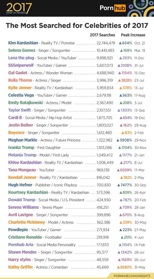 Searches for our very own, Pornhub Aria (social media royalty) increased by a whopping 1154% on Valentine’s Day, thanks to her super sexy pics promoting our annual Free Premium giveaway on the holiday. Searches for soon to be ‘Princess’ Meghan Markle (actor) shot up by 5908% on November 29th, the day Prince Harry and Meghan announced their engagement. Cardi B (Hip Hop Artist), Serena Williams (Tennis Player), Bella Thorne (actor/singer) and last but not least Beyonce, all had some big surges in searches as well, the latter’s occurring primarily on the day she announced on Instagram that she was having twins. It really is all fun and games though, with several gamers making the list (SSSniperwolf, Pewdiepie and Celestia Vega) with everyone’s favorite redhead Kathy Griffin closing the list with an 8580% increase in searches the day CNN announced her termination after she posted a now infamous photograph.