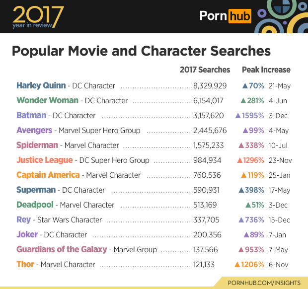 This year’s list of popular movie character searches displays an ongoing rivalry between Marvel Superheroes vs. DC Characters and then of course Rey (portrayed by Daisy Ridley) from Star Wars, who was also on last year’s list, returns again this year with a bang when the ‘The Last Jedi’ opened in theaters with a 736% bump up in searches. Harley Quinn (Suicide Squad) holds it down with the search volume increase with over 8 million searches, on May 21st, perhaps due to the release of the new ‘Harley Quinn’ 26-episode animated series. It is no wonder that Wonder Woman searches shot up by 281% on the film’s premiere date landing her with the second highest number of searches on this list for 2017. Batman got bumped down to third position from last year but holds on to a superhero’s share of searches, with a 1595% boost.