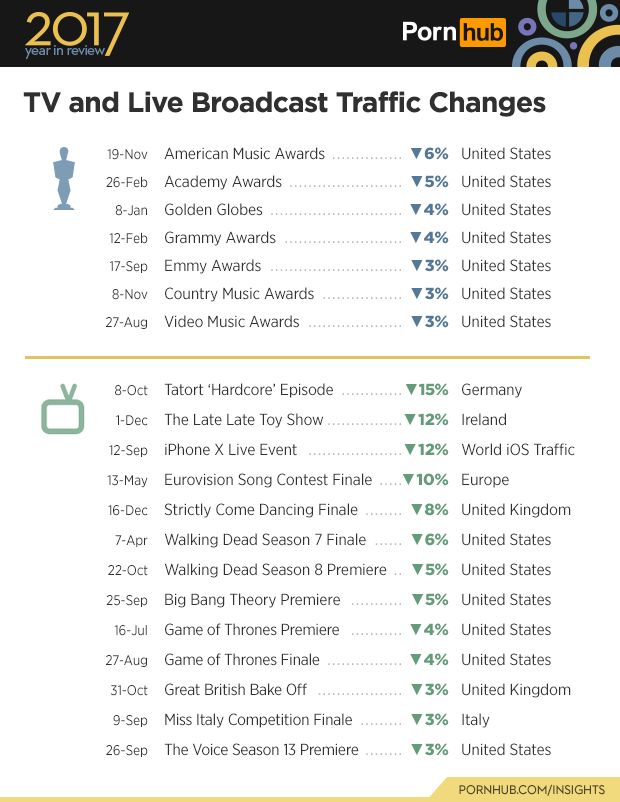 If you were wondering how the Great British Bake Off finale impacted people getting off on Pornhub this year, the answer is traffic declined by 3% in the UK. The German show Tatort’s ‘Hardcore’ episode (a television series that has been running since 1970!) caused the biggest blow to site traffic, dropping by 15% in Germany. The Late Late Toy Show, unwrapped on December 1st in Ireland, making for a 12% dip in traffic to the site. The Big Bang Theory premier caused a pause in all the other banging, dropping traffic down by 5%. During Apple’s Live iPhone X Event, traffic from Apple-based mobile devices dropped by 12%.