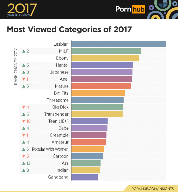 The popularity of ‘MILF‘ (nsfw) grew by 2 positions, and ‘Hentai‘ (nsfw) increased by 3. There were also some dips compared to last year, including ‘Anal’, which dropped 3 spots over the course of 2017, compared to the year prior where it gained 4. ‘Threesome’ also lost one spot as opposed to last year where it gained two. The ‘Female Friendly’ category was recently renamed to ‘Popular with Women‘ and grew in rank by 3 positions since 2016.