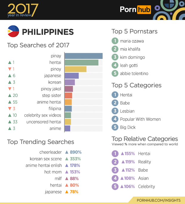 The texting capital of the world aka. The Philippines enjoys viewing the reality category 119% than the rest of the world, but seem to enjoy escaping as made evident by the fact that ‘Anime Hentai’ made its way up by 55 spots on the top searches, even bumping down ‘filipina’ three positions.