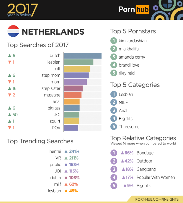 Notoriously known for being one of the healthiest countries in the world with respect to their eating habits, it’s arguable that that Pornhub users in The Netherlands also have a very healthy sexual curiosity. Seemingly very into the idea of going ‘public’ which increased in searches by 163%, ‘dutch’ also made its way up 6 spots from last year on the top searches list. ‘JOI’ (Jerk Off Instruction) made a 50 spot leap closer to the top, landing at a respectable 10th place on the list of top searches in the country this year, translating to a 115% increase in searches for the term there overall. ‘Lesbian’ remains number one for the most viewed category, and searches for ‘lesbian’ also increased by 45%, which comes as no surprise considering the Dutch were the first in the whole wide world to legalize gay marriage. The ‘Bondage’ category is 66% more popular in the Netherlands than the rest of the world and the ‘Outdoor’(s) category is also more popular here by 42%, which is nothing for a country that built an entire province (Flevoland) out of reclaimed land from the sea.