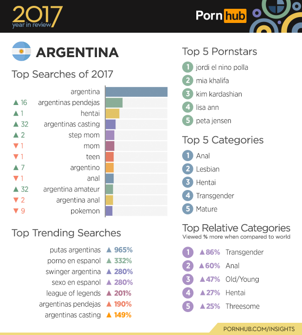 In Argentina, ‘Transgender’ porn is the fifth most popular category and 86% more likely to be viewed here than elsewhere in the world. This could maybe have something to do with the fact that Argentina has some of the most comprehensive transgender rights laws in the world! The country’s interest in ‘anal’, which is the top viewed category there, is also viewed 60% more in Argentina in comparison to the rest of the world. Searches for ‘League of Legends’ are also on the rise by a cool 201% from last year.