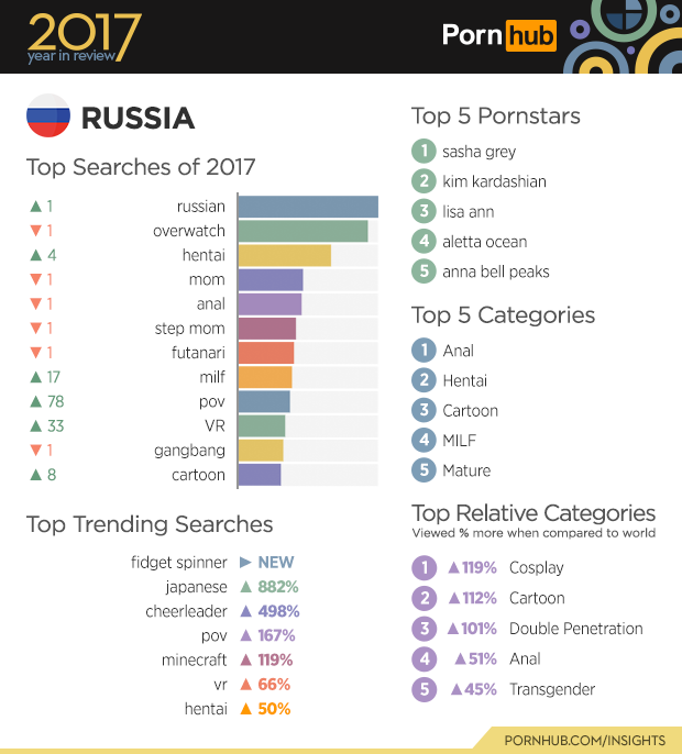In Russia ‘Cosplay’ as a category was 119% more popular compared to everywhere else, this likely has something to do with how huge the ‘Russian Comic Con’ is. Similarly, ‘Cartoon’ moved ahead 8 spots on the top searches and as such it’s not shocking that the ‘Cartoon’ category is twice as popular in Russia as it is anywhere else in the world. ‘POV’ (point of view) made a huge sprint ahead, by 78 spots landing it in 9th place on Russia’s list of most searched terms on Pornhub, resulting in a search increase of 167% compared to last year.