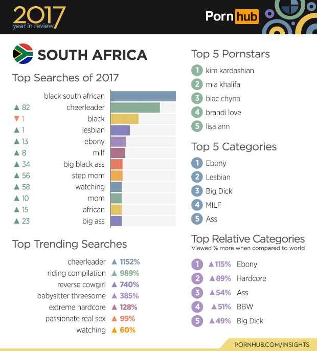 We are approaching the sunset of our top 20 countries with South Africa, where searches for ‘riding compilation’ increased by 989% along with ‘reverse cowgirl’ up by 740%. Kim K claims the top spot as the country’s most searched for porn star, while ‘black south African’ tops the list of the country’s most popular search terms.