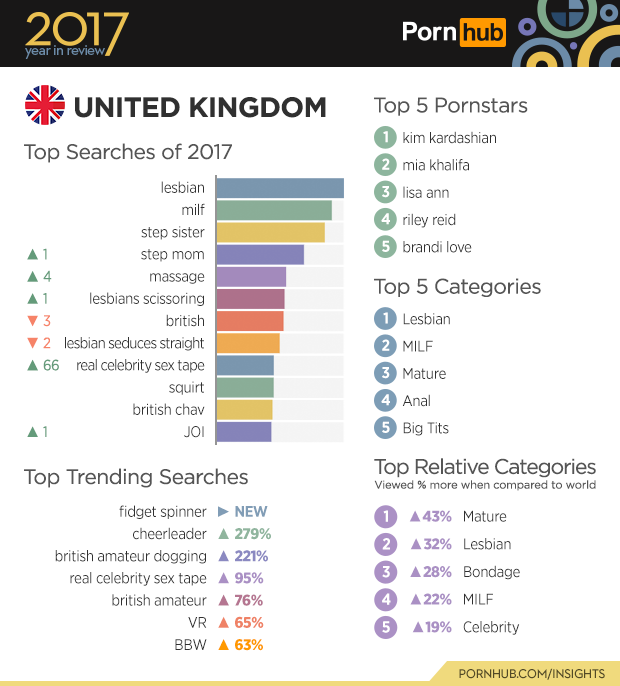 The United Kingdom knows that when it comes to the finer things in life like wine and porn, age is a good thing – as made evident by the fact that there is a 43% increase in views in the ‘Mature’ category there. The Brits also seem to enjoy life on the wild side with searches ‘British amateur dogging’, (slang for public sex) up by 221%. AND just to be clear, everyone is looking up fidget spinners… though if our traffic numbers are any indication it would make sense that people are always looking for something to do with their hands.
