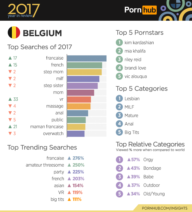 If there’s one thing that Belgium was on the search for this year it was ‘francaise’ porn which soared up 17 spots on the top searches to the number 1 spot the list, and growing by 276% in popularity in one year. Similarly, ‘french’ jumped up by 15 spots on the top searches list, translating to 203% more searches than last year. ‘Lesbian’ steals number one position for most viewed category this year, with ‘MILF’ in second place, just a step behind. The ‘Orgy’ category is 57% more popular in Belgium which may also explain why the ‘party’ searches have increased by 225%. Sounds like there’s a pretty exciting nightlife in Belgium.