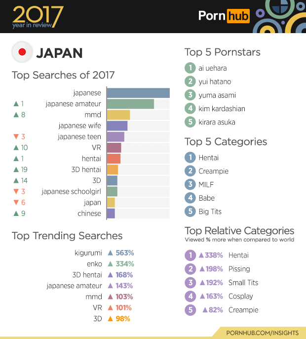 It is the third year in a row that ‘Lesbian’ (nsfw) maintains 1st place for most viewed categories on Pornhub! The significant increases come via two different ethnicities; ‘Indian’ (nsfw) and ‘Japanese’ (nsfw) jumped a respective 13 and 7 positions this year landing them at 19th and 6th place on the list. The increased popularity of those two categories was helped by the traffic growth we saw from both Japan and India in 2017.