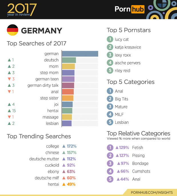 In Germany, Riley Reid only ranks 5th, meaning the top 4 pornstars appear to be a fresh roster of German talent including Lucy Cat (nsfw) and Lexy Roxx (nsfw). This doesn’t seem odd because they always seem to be doing their own thing, it’s whatever gets you going… and for Germany that might be Germans which is why ‘deutsch’ jumped up one spot on the top searches list. The country is however, entering some new territory with the ‘Fetish’ category being viewed here 129% more than elsewhere in the world – same with the ‘pissing’ category at 127% (this may not be a coincidence). ‘Hentai’ made the largest leap up 15 spots from last year, making a significant move towards the country’s top searches.