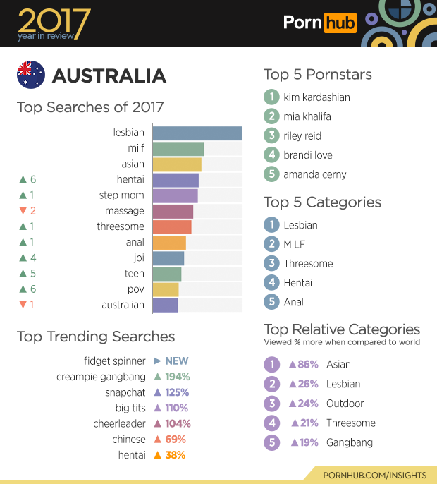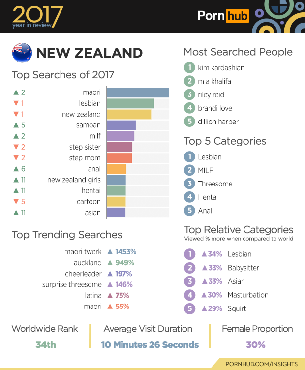 In 2017, searches for “maori” gained two positions to became New Zealand’s number one search term, outranking both “new zealand” and “samoan”. More maori favoritism was shown by the top trending search of “maori twerking” increasing by 1453% over the previous year. Visitors from New Zealand last about half a minute longer on Pornhub compared to their neighbors in Australia, and have a higher proportion of female visitors at 30%.