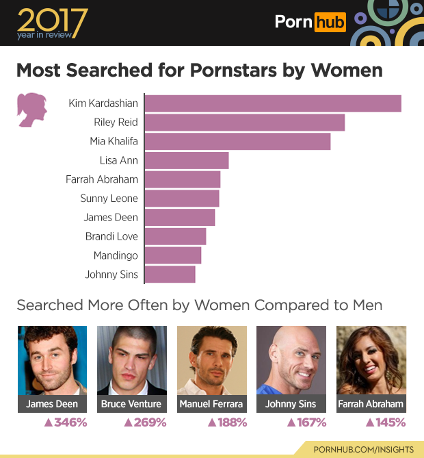 Once again, Kim Kardashian remains the most searched Pornstar by women, and Mia Khalifa is now in third place after being surpassed by Riley Reid who is sitting quite comfortably at second place for the year. There are some new additions to the list since last year, including Brandi Love (nsfw) (whom is also the co-owner and chief financial officer of two multimedia companies) and Johnny Sins (nsfw) (said to be one of the most popular performers in porn for the Millennium-class). Johnny was searched for 167% more by women, as well as Bruce Venture (nsfw) who was searched for 269% more by female viewers to the site than by men.