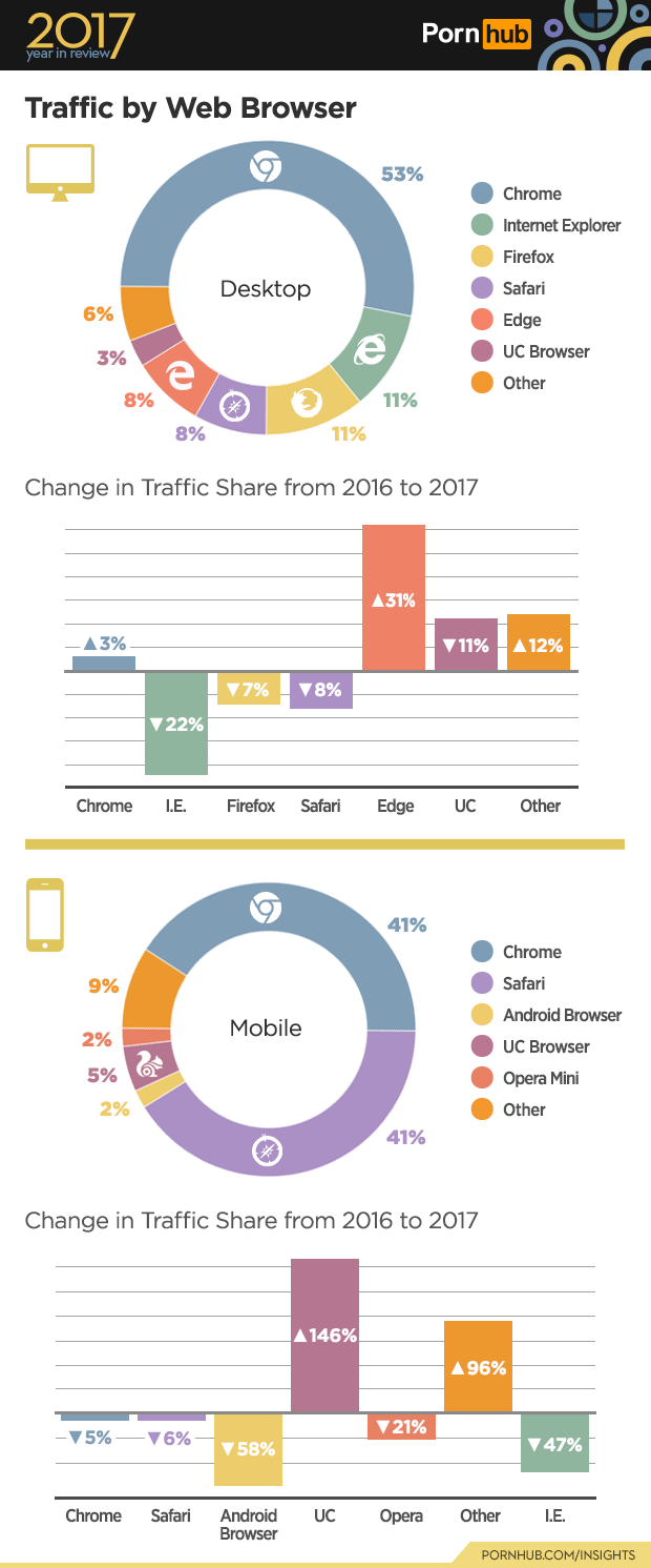 Nintendo’s original Wii had a large decrease, while the updated WiiU now accounts for 5% of console visits. Nintendo’s newest Switch doesn’t yet have a browser, although it’s rumored that one will be implemented sometime in 2018 — at which time you can be sure Pornhub’s development team will work to ensure full support.