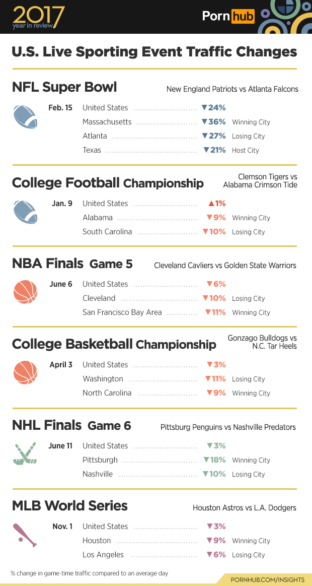 Many of Pornhub’s biggest traffic drops happen during live sporting events. Football fans seem to be the most dedicated to their sport, with traffic across the United States dropping by 24% during the Super Bowl. The largest drops typically happen in cities that are home to the playing teams. For example, traffic in Boston dropped by 36% during game-time, as fans watched the Patriots run to victory over the Falcons. To see how game-time traffic changes by hour, you can check out our complete Super Bowl 51 Insights. We also recorded major traffic changes during the NBA Finals , NHL and MBL World Series throughout 2017.