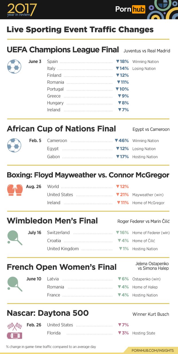 It’s not only national sports teams that cause major traffic drops. One-on-one sports like the Mayweather vs McGregor match caused a 21% drop across the United States, and 11% reduction in McGregor’s home turf of Ireland even during the wee-hours when it aired live. Tennis fans tuned out of Pornhub to watch the Wimbledon and French Open Finals, and 7% less racing fans in the U.S. visited Pornhub during the Daytona 500.