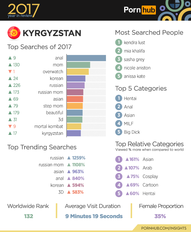 Visitors from Kyrgyzstan showed a lot of increased interest in “russian” and “russian mom” searches in 2017. Our statisticians also found a significant increase in the popularity of both “asian” and “korean” (nsfw) searches. The proportion of female visitors from Kyrgyzstan is quite high at 35% compared to the world average of 26%. Visitors are 161% more likely to view the Asian category, and 107% more interested in the Arab category.