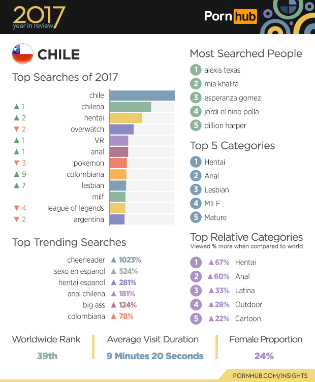 Things really heated up in Chile in 2017, where searches for “cheerleader” grew by an impressive 1023%. Hentai remains Chile’s most viewed category, and is viewed 67% more often when compared to the rest of the world. Visitors from Chile spend about 40 seconds less time on Pornhub than the worldwide average, and 24% of traffic is identified as female.