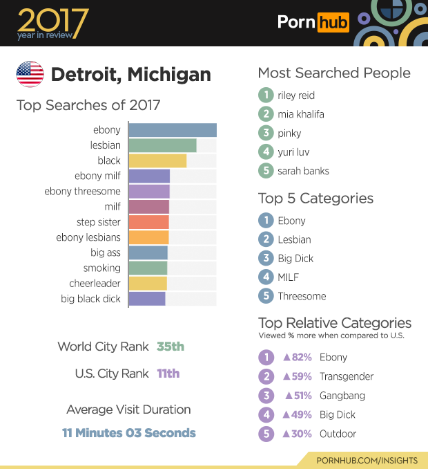 Detroit ranks 11th for U.S. cities bringing traffic to Pornhub, and 35th among all cities worldwide. “Ebony” tops the list of searches in the city of Detroit, followed by “lesbian” and “black”. Visitors from Detroit hold out about 30 seconds longer than the U.S. average visit duration of 10 minutes 33 seconds. The “ebony” category is 82% more popular in Detroit compared to elsewhere in the U.S., followed by a 59% increase in the popularity of “transgender” videos. Check out our 2017 State of the Union to see how each state fared in 2017.