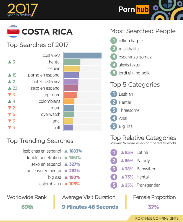 Costa Rica ranks 122nd worldwide for population, but a respectable (and sexy) 69th for traffic coming to Pornhub. Their favorite search is “costa rica”, and searches for “double penetration” widened by an impressive 1300% in 2017. Costa Rica has one of the highest proportions of female visitors at 37% compared to the worldwide average of 26%. Costa Ricans are 66% more likely to view the Parody video category than people in other countries.