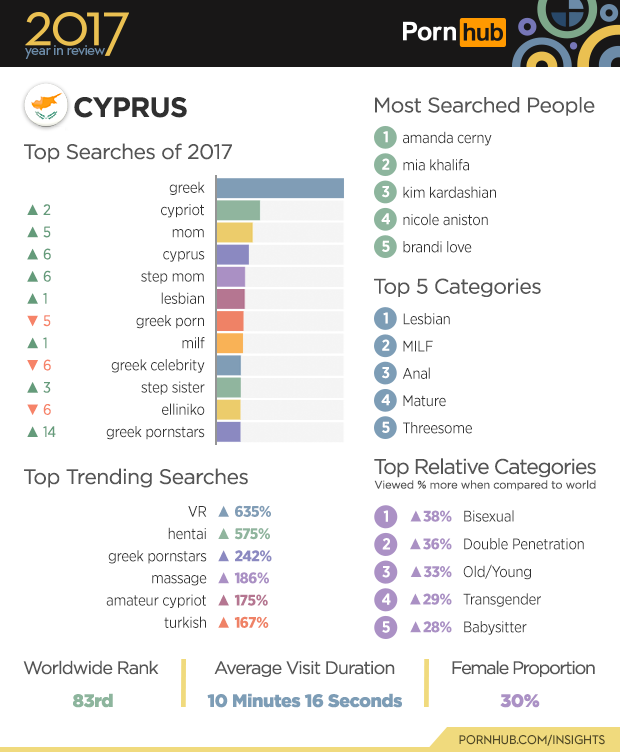 Cypriots spend 17 seconds longer on Pornhub than the average visitor worldwide, and have a much higher percentage of female visitors at 30%. Although they only rank 159th worldwide for population, they turn in a respectable rank of 83rd for traffic to Pornhub. While “greek” remains the most popular search, we recorded growth in the popularity of both “VR” and “hentai” searches in 2017.