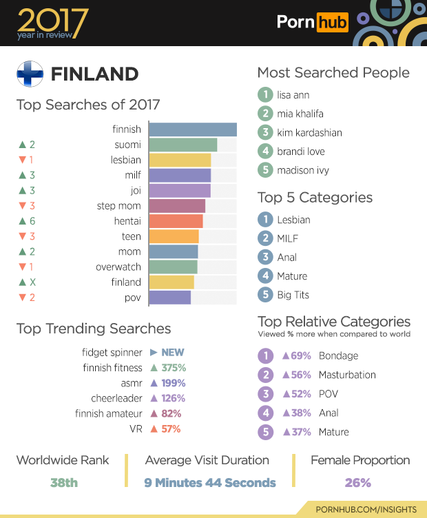 Finland ranks 38th worldwide for traffic to Pornhub, even though it only ranks 116th for world population. The most popular search remains “finnish” for the 3rd year in a row, with “suomi” moving up into second place. As with many other parts of the world, “fidget spinner” was the top trending search of 2017, followed by a 375% increase in the popularity of “finnish fitness”. Visitors from Finland are 69% more likely to view the “Bondage” category when compared to the rest of the world, and 52% more into “POV” (Point of View) videos.