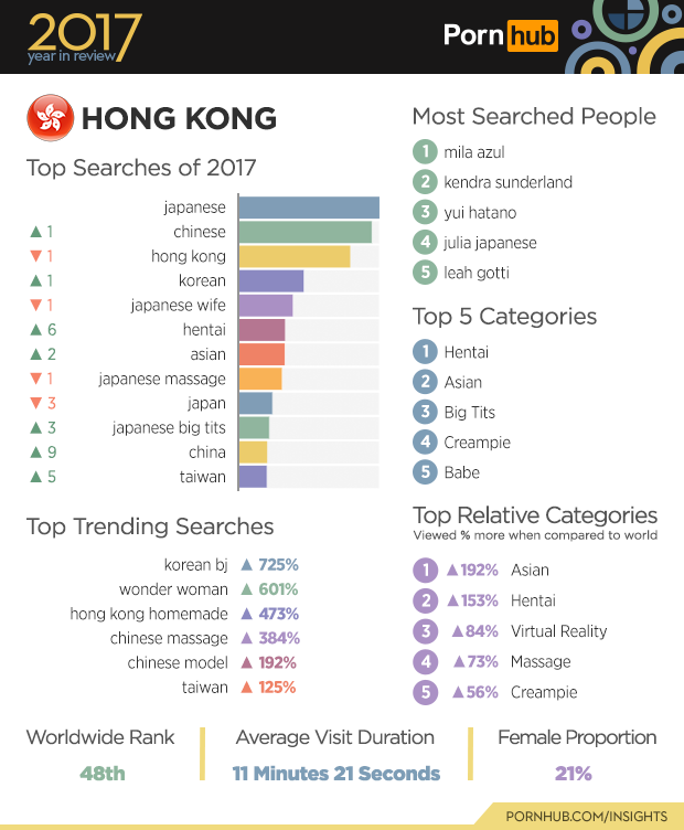 Visitors from Hong Kong are 192% more likely to watch the Asian category that elsewhere in the world. It’s perhaps unsurprising then that their top searches from 2017 are varieties of Asian nationalities including “japanese”, “chinese”, “hong kong”, “korean” and “taiwan”. The biggest gaining search of 2017 was “korean bj” by 725% over 2016. Hentai remains Hong Kong’s most viewed category, and is watched 153% more than in other parts of the world.