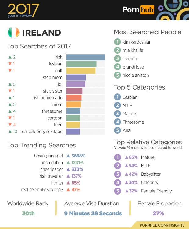 Gaining two positions, “irish” became the number one search in Ireland in 2017, causing the popularity of “lesbian” and “milf” to drop slightly. The top trending search “boxing ring girl” grew by 3668% in 2017, along with a 1231% increase in searches for “irish dublin”. Visitors from Ireland, of which 27% are female, are 65% more likely to view the “mature” category and 54% more into “MILF”. Visitors from Ireland come and go about half a minute faster than their neighbors in the United Kingdom.