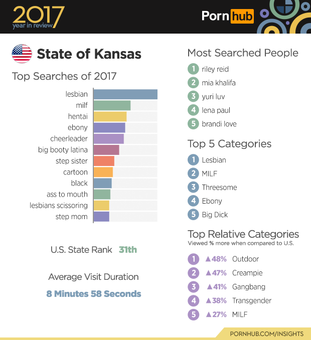 The state of Kansas ranks 31st amongst U.S. states for traffic to Pornhub, and comes up a bit short with an average visit time of only 8 minutes 58 seconds compared to the U.S. average of 10 minutes 33 seconds. Visitors from Kansas are 48% more likely to view the “Outdoor” category when compared to the rest of the country, and 47% more into “Creampie” videos. Check out our 2017 State of the Union to see how each state fared in 2017.