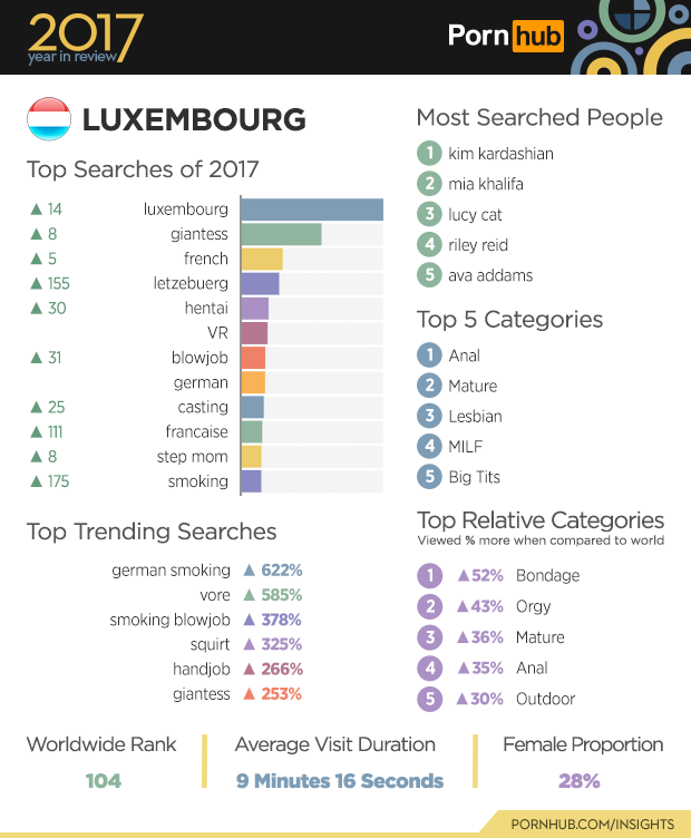 Searches for “giantess” saw big gains in Luxembourg in 2017, moving up 8 positions to become the second most popular search after “luxembourg”. Searches for “smoking” gained 175 positions to make the top 12, and both “german smoking” and “smoking blowjob” were top trending terms in 2017. Visitors from Luxembourg are 52% more likely to view the “Bondage” category when compared to the rest of the world, and 43% more into “Orgy” videos.