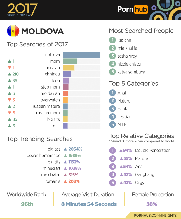 In Moldova, searches for “big ass” made a big increase in 2017, growing by 2054% in popularity. Searches for the capital city of “chisinau” gained 210 positions to become the 4th most popular search overall. While “Anal” remains the most viewed category, visitors from Moldova are nearly double as likely to watch “Double Penetration” videos compared to visitors elsewhere in the world. At 38%, Moldova also has one of the largest proportions of female visitors.